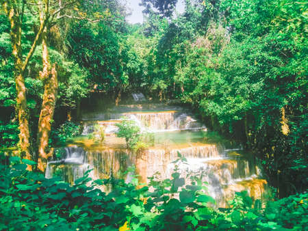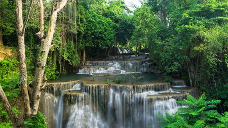 Huay Mae Khamin waterfall in Kanchanaburi, Thailand South east asia Jungle landscape with amazing turquoise water of cascade waterfall at deep tropical rain forest. travel landscape and destinations