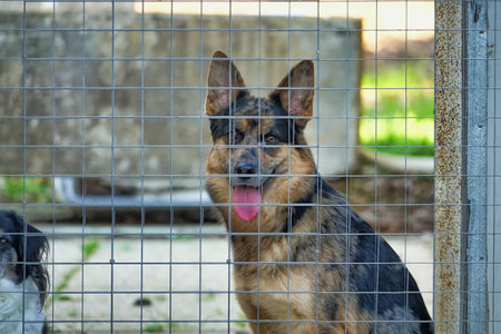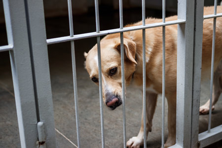 Lonely dog waiting for adoption in a shelter kennel. Sad dog in an animal shelter cage. Abandoned dog behind bars, shelter life is tough. Shelter dog waits for home