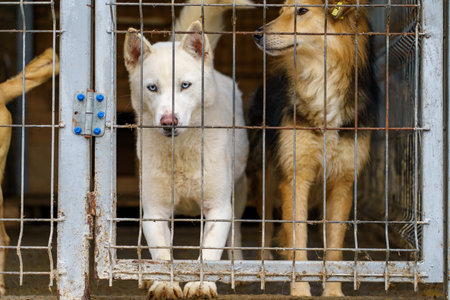 Two homeless dogs in iron enclosures. Animal protection concept