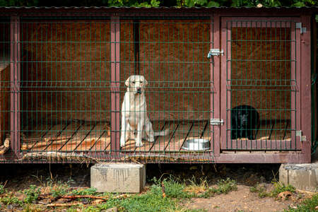 Dog in a dog shelter. Background with selective focus and copy space for text