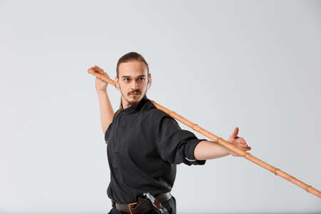 Kendo guru wearing in a traditional japanese kimono is practicing martial art with the shinai bamboo sword against a black studio background.