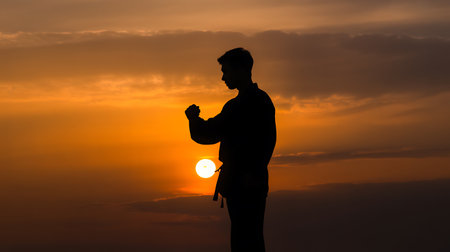 A martial artist stands confidently in a powerful pose, surrounded by a warm orange glow, embodying focus and strength during a training session in a dojo at sunset.