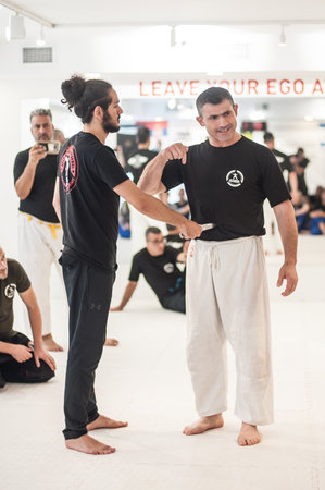 ISTANBUL, TURKEY - Maj 30 - Jun 02. 2019. Kapap instructor Altin Qoku, demonstrates disarm defense techniques against threat or knife attack on GENERAL MEETING OF KAPAP INSTRUCTORS
