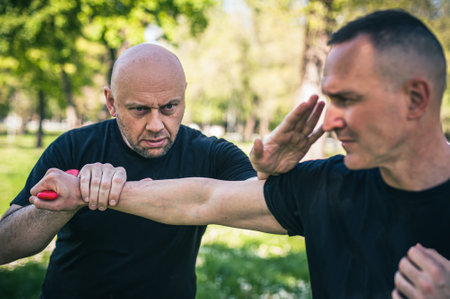 Athletes in black T-shirts are performing techniques of Wing Chun
