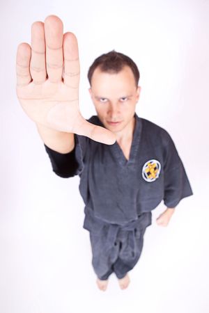 A man in a black kimono practices martial arts using shadowboxing against a light colored grid background.