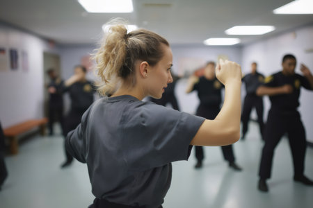 Group of police cadets practicing martial arts and self defense techniques during training in academy