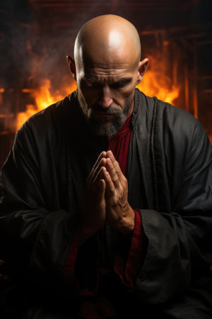 A seasoned martial artist stands with his fists clenched, showing determination and strength. Dressed in a traditional training outfit, he embodies the spirit of discipline and readiness. The ambiance evokes a sense of respect for the art.
