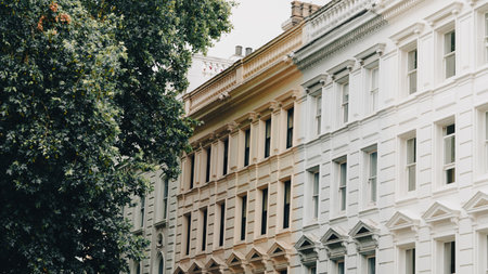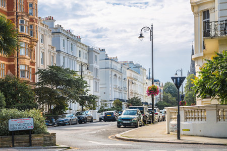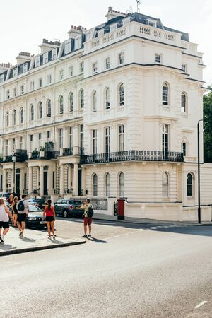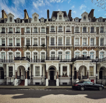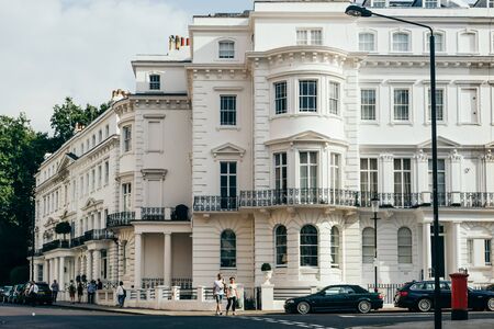 London, UK - 9 September, 2023: Beautiful periodic building of Kensington, one of the richest areas to live with fancy lifestyle. Street photography
