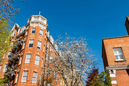 Sunny view of apartment cityscape with tree blossom at London, UK