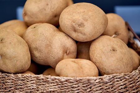 New potatoes on the store counter, vegetable theme, Fresh organic potatoes.