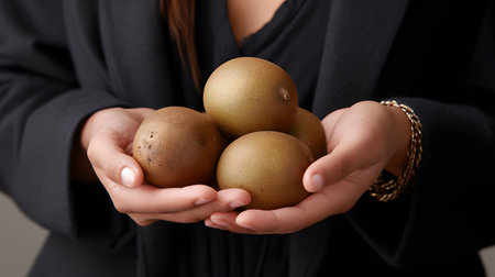 Unrecognizable person holding potatoes in hands. Stack of raw vegetables isolated on black background. Studio shot. Front view. Agriculture and cooking at home concept