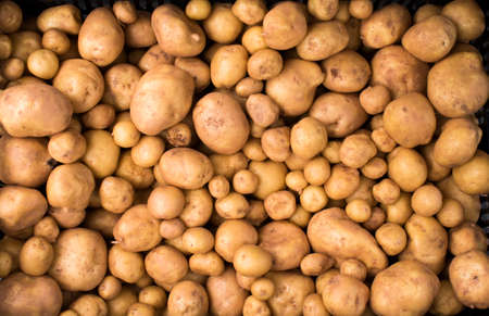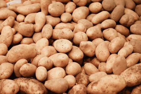 Fresh organic potatos in the market. Heap of potatos root. Close-up potatos texture. Macro potato.