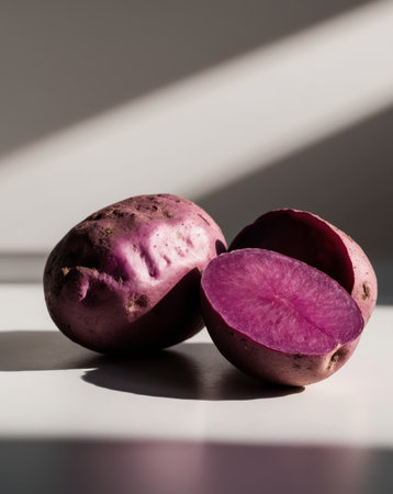 AI Generated. Purple potato showcased whole and halved revealing its vibrant flesh and unique texture