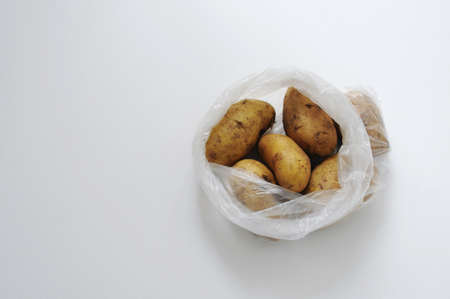 Potatoes in a plastic bag. Food wrapped in cellophane package on white background. Non-ecological packaging