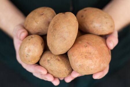 Farmer holding fresh harvested organic potatoes in his hands. Close up.
