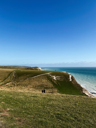 East Sussex | UK - 2021.04.04: People walking the paths of the Seven Sisters, Clifftop Paths Nature Reserve View of the Chalk Cliffs and the English Channel sea from the edge. South of England