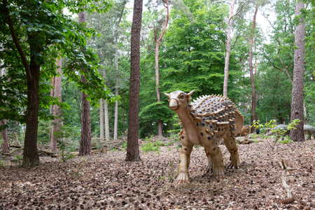 Realistic figure of an Sajchania dinosaur inforest park in Kazimierz Sosnowiec. Prehistoric predator create a fascinating element of the landscape, attracting dinosaur lovers. Sajchania dinosaur.