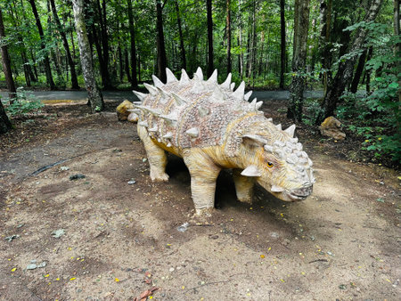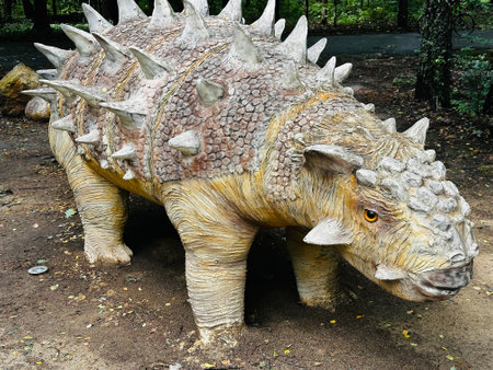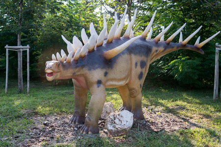 Belgorod, Russia - September 10, 2022: Statue of stegosaurus in park. Dinopark of Belgorod city.