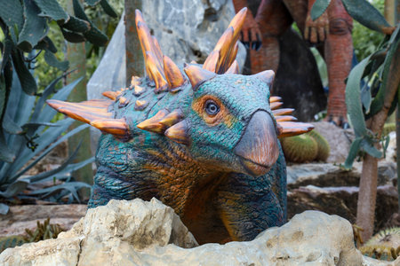 Close-up of a robotic dinosaur of the stegosaurus species in an amusement park