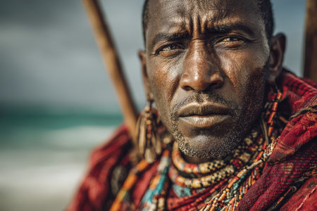 Man in traditional attire, adorned with colorful beads, gazes into the distance, reflecting cultural pride and connection to nature in a tranquil coastal setting