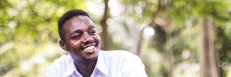 African man in a white shirt sits and laughs happily in the park. Concept of positive thinking and happy living