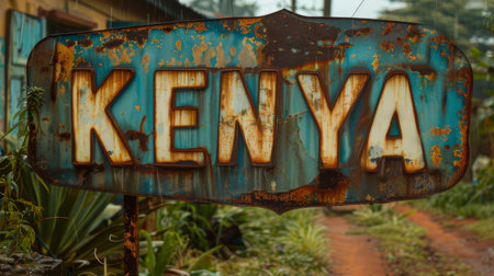 A weathered and rusty metal sign spelling out 'Kenya' stands amid tropical vegetation, depicting a sense of age and history in a natural setting.