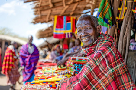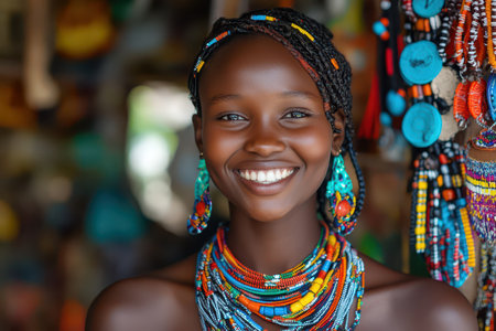 Portrait of a Maasai artisan wearing traditional colorful beadwork necklaces in a Kenyan market