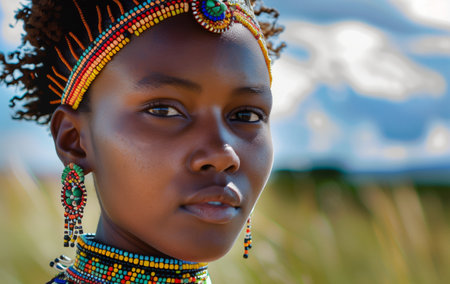 Young woman in traditional beadwork and intricate jewelry gazes confidently, with natural outdoor lighting highlighting her features against a soft background of sky and landscape