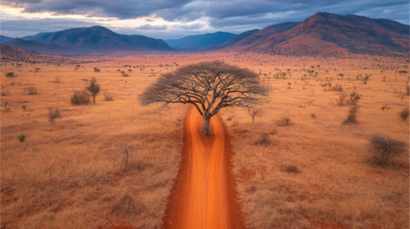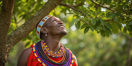 A man adorned in colorful traditional attire stands peacefully in the savanna, surrounded by acacia trees. Sunrise casts a warm glow on the landscape, highlighting distant wildlife.