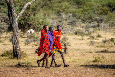 Three young Masai warriors in traditional clothes and weapons are walking in the savannah. Tanzania, East Africa, August 12, 2018.