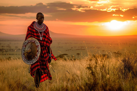 A tribesman dressed in colorful attire stands against a stunning sunset, overlooking an expansive savannah filled with wildlife. The horizon glows with warm hues.