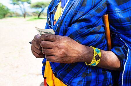 Tribal masai hand with a colorful bracelet and classic blue color outfit. Tanzania, East Africa, Close up.