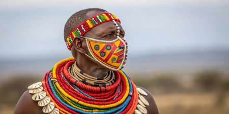 Samburu man wearing colorful beaded jewelry and traditional mask