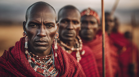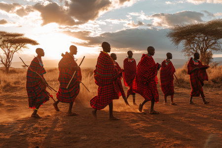 A lineup of Maasai warriors dressed in vibrant traditional attire showcases their rich culture and heritage during a ceremonial event in the Kenyan savannah. The setting sun casts a warm glow.