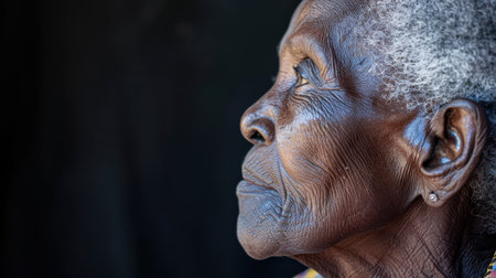 Portrait of an elderly African woman in traditional attire on a black background, close-up.