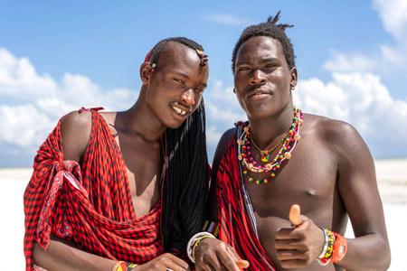 Zanzibar, Tanzania - December 12, 2019: African two men masai dressed in traditional clothes standing near the ocean on the sand beach of Zanzibar island, Tanzania, East Africa, close up