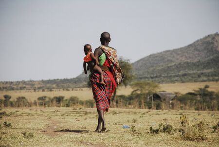 Masai Mara, Kenya - September 04, 2006: Masai tribal woman carrying her baby walking through the savanna