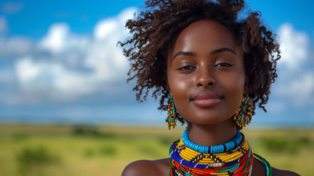 Juneteenth, a day for freedom. A beautiful black woman wearing traditional Maasai attire, standing in the Serengeti. She is adorned with colorful beaded necklaces and earrings