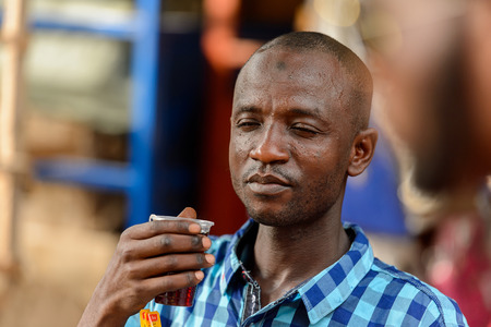 LOME, TOGO - Jan 9, 2017: Unidentified Togolese man holds a cup of tea in his hands at the Lome central market. Togo people suffer of poverty due to the bad economy