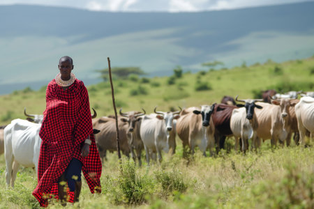 Maasai man in traditional attire walks peacefully with cattle in the african savanna, showcasing the tribe's deep connection to land and livestock