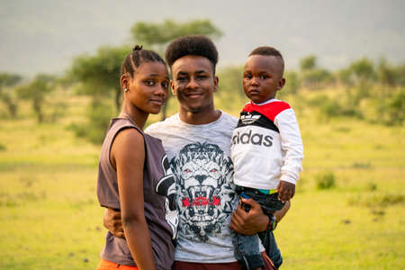 Tanzania, Arusha - January 2020: Young Black African Smiling Family in Savannah