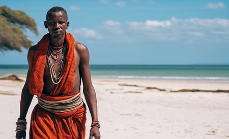 Zanzibar, Tanzania - november 11, 2019 : African man masai dressed in traditional clothes standing near the ocean on the sand beach, Zanzibar, Tanzania