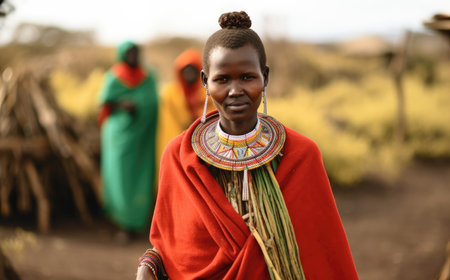 Portrait of woman from the Maasai tribe standing in her village, Tribe, Ancient tribe.