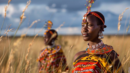 A portrait of an African woman in traditional attire gazing at the vast savanna. She stands amidst tall grasses, her gaze directed towards the distant horizon, conveying a sense of peace and tranquility.