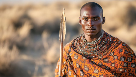 Young maasai man wearing traditional clothing is holding a spear in the savanna