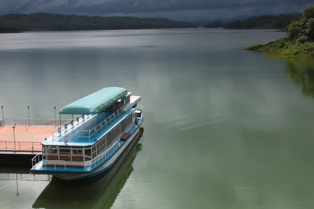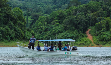 YALA, THAILAND - DEC 3, 2018 : Tourists take a boat to see the scenery of the forest, wildlife and Bang Lang reservoir on December 3, 2018. Bang Lang reservoir is in area of Hala-Bala Wildlife Sanctuary. There are various animals live around here.