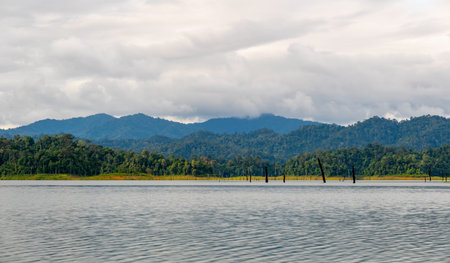 Blue lake and green forest in the morning light at Rajjaprabha Dam in Suratthani, Thailand.