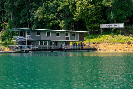 TERENGGANU. MALAYSIA - SEPTEMBER 15, 2019 : Beautiful houseboat crusing through the lake with mountain view at Kenyir Lake. Kenyir Lake also known as Tasik Kenyir, it is the largest man-made lake in South East Asia with an area of 260,000 hectares.