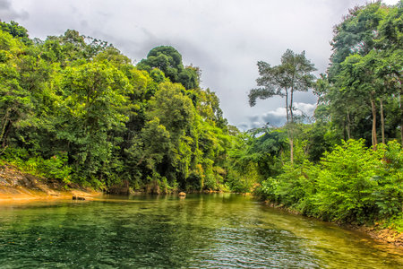 Scenic Southeast Asian river winding through dense jungle, peaceful and untouched nature