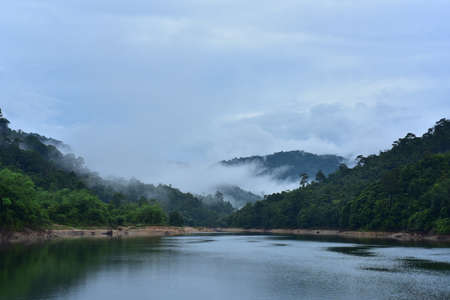 Landscape of mountain and river with fog in the morning, Thailand